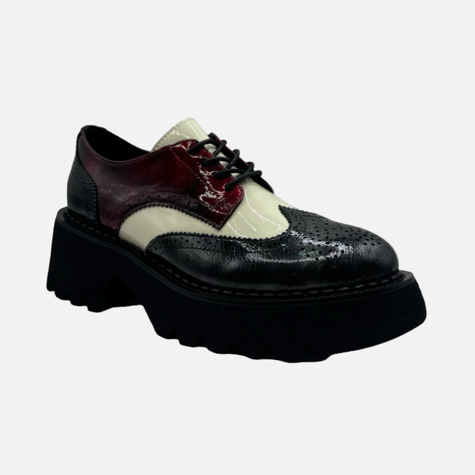 Contemporary take on the lace-up brogue featuring sleek patent leather upper with a textured, glossy finish. Even with its chunky platform sole this shoe is very light to wear.