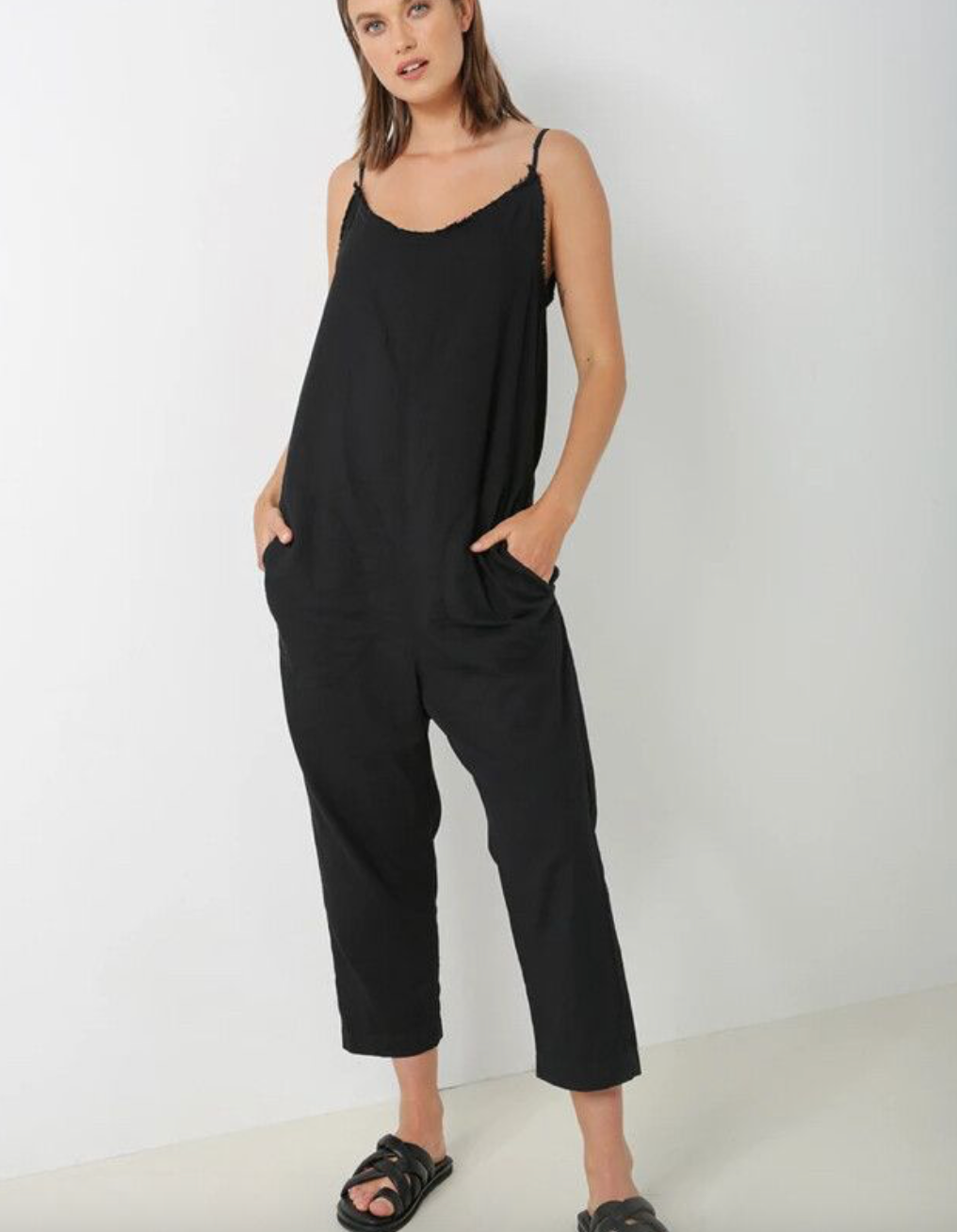 Tress Moochi relaxed jumpsuit with fraying around neck and arm with adjustable cami straps.